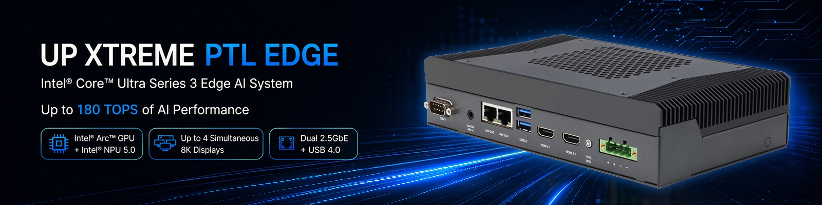 The UP Xtreme PTL Edge is designed to harness the performance of Intel® Core™ Ultra Series 3 processors, delivering up to 180 TOPS of AI performance in a compact mini PC form factor. Built on Intel’s new performance hybrid architecture, the system integrates Intel® Arc™ GPU graphics and a power-optimized Intel® NPU 5.0 to support demanding edge AI workloads.