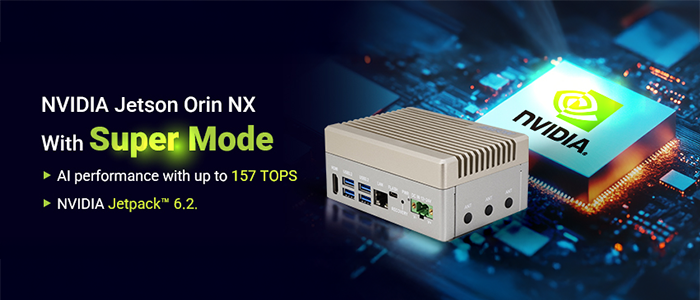 AAEON’s first embedded AI system equipped with the NVIDIA® Jetson Orin™ NX with Super Mode, the BOXER-8651AI-PLUS offers a substantial boost in AI performance with up to 157 TOPS. Alongside this, the system leverages the enhanced software stack, greater flexibility in power consumption, and performance optimization available through NVIDIA Jetpack™ 6.2.